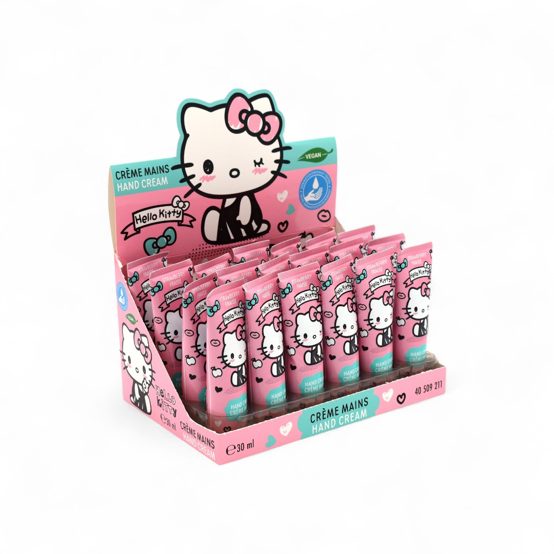 Una crema mani idratante e leggera, racchiusa in una confezione compatta e decorata con Hello Kitty. Il formato da 30 ml è perfetto da tenere in borsa o da regalare.
