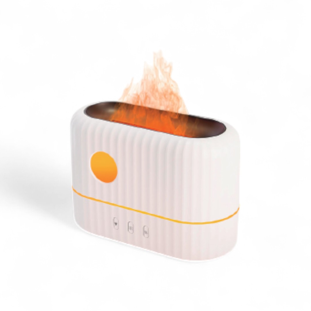 Diffusore di fragranze ad ultrasuoni con effetto fiamma, luce LED giallo caldo regolabile, grande serbatoio da 200 ml e funzionamento continuo o intermittente. Elegante, silenzioso e sicuro, è disponibile nei colori bianco, nero oppure nella versione espositore da banco.